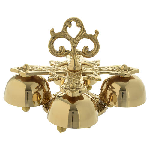 Liturgical bell with 4 sounds in gold-plated brass. Cross shaped bell with 4 sounds 16,5 cm large.